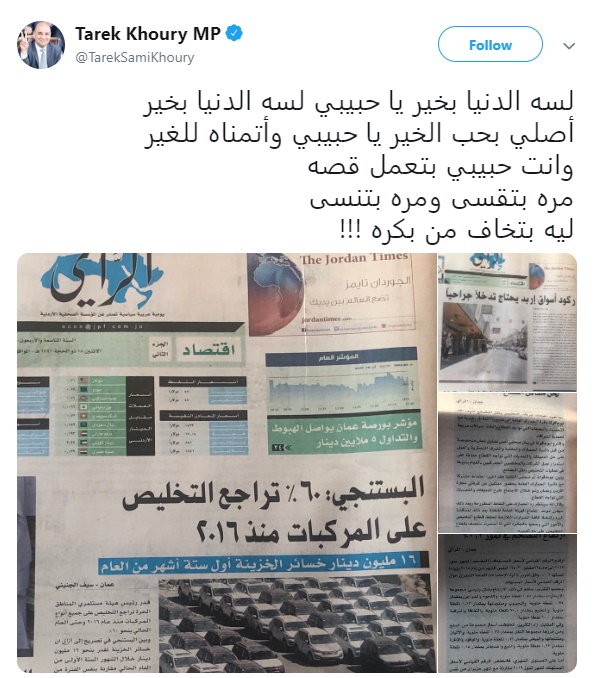 عمان1:استعان النائب طارق خوري، بكلمات أغنية للفنان السوري، جورج وسوف، في وصفه للوضع الاقتصادي في الأردن، غداة نشره الصفحات الأولى للصحف الأردنية الورقية، وما تضمنته من أخبار تتعلق بالشأن الإقتصادي للمملكة.