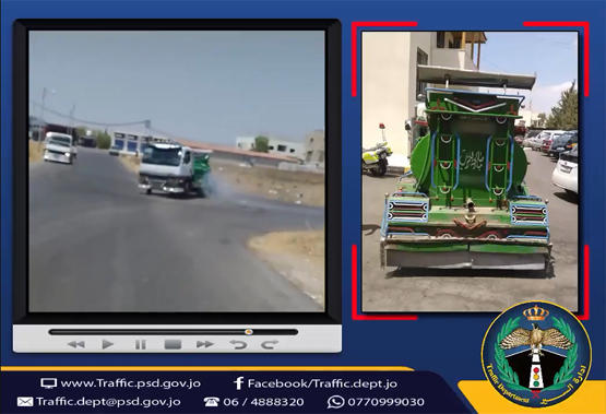 عمان1:تمكن العاملون في إدارة السير / مباحث إقليم الشمال من ضبط صهريج مياه، ظهر سائقه في مقطع فيديو يمارس التشحيط والقيادة بطريقة متهورة و إستعراضية في محافظة اربد.