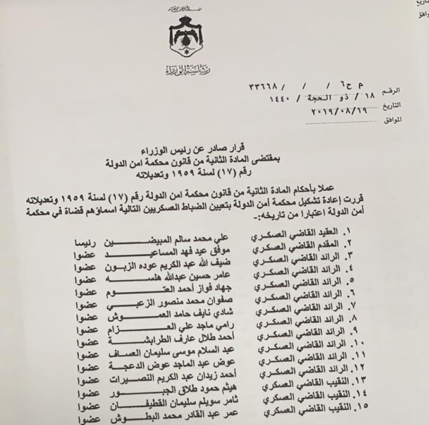عمان1:قرر مجلس الوزراء في جلسته التي عقدها اليوم برئاسة رئيس الوزراء الدكتور عمر الرزاز، إعادة تشكيل محكمة أمن الدولة، وتعيين العقيد القاضي العسكري علي مبيضين رئيسا لمحكمة أمن الدولة.
