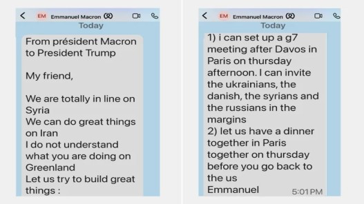 عمان1:شهدت منصات التواصل الاجتماعي حالة من الجدل والسخرية بعد أن نشر الرئيس الأميركي دونالد ترامب عبر حسابه على منصة "تروث سوشيال" صورا لمقتطفات من رسائل بعثها إليه الرئيس الفرنسي إيمانويل ماكرون، يظهر فيها اقتراح فرنسي بعقد اجتماع لمجموعة السبع في باريس بعد ظهر يوم الخميس، عقب منتدى دافوس...