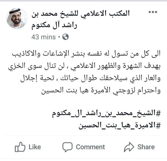 الى كل من تسول له نفسه بنشر الإشاعات والاكاذيب بهدف الشهرة والظهور الاعلامي، لن تنال سوى الخزي والعار الذي سيلاحقك طوال حياتك، تحية إجلال واحترام لزوجتي الأميرة هيا بنت الحسين.