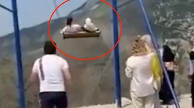 وبينما بدأ الدفع بشكل طفيف، أخذ ذلك الشخص بدفعهما بشكل أقوى، حتى اختل توازن الأرجوحة، ما قاد إلى ارتطام حافة المقعد بأحد أعمدتها، ومن ثم سقوط الراكبتين عنها بشكل يوحي للمشاهد بأنهما سقطن في عمق الوادي، وسط صراخ الحضور.