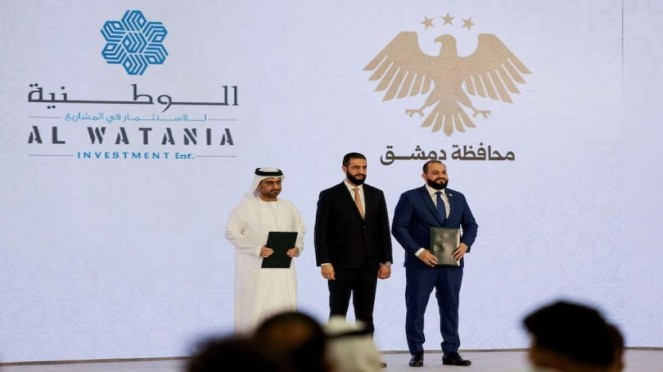 وقال: نعلن اليوم عن مجموعة من الشراكات الاستراتيجية الكبرى وعددها 12 مشروعا بقيمة اجمالية تبلغ 14 مليار أمريكي ستمتد عبر سوريا لتشكل نقلة نوعية للبنية التحتية والحياة الاقتصادية، معتبرا أن من بين أبرزها مطار دمشق الدولي باستثمار يصل إلى 4 مليارات دولار، ومترو العاصمة باستثمار يبلغ ملياري دولار، إلى جانب مشروع أبراج دمشق في ريف العاصمة باستثمار يقدر بملياري دولار، ومشروع أبراج ومول البرامكة داخل العاصمة باستثمار يصل إلى 560 مليون دولار.