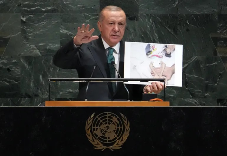 ورفع أردوغان خلال كلمته صورة قال إنها للحياة اليومية في غزة، وهي صورة لنساء تحملن أطباقا في أيديهن، وقال "أنصت إلى ضمائركم أجيبوا على السؤال التالي: هل من منطق معقول يبرر هذه الوحشية في هذا العام 2025؟ هذه الصورة المخجلة في غزة قائمة وتتكرر يوما بعد يوم خلال 23 شهرا".