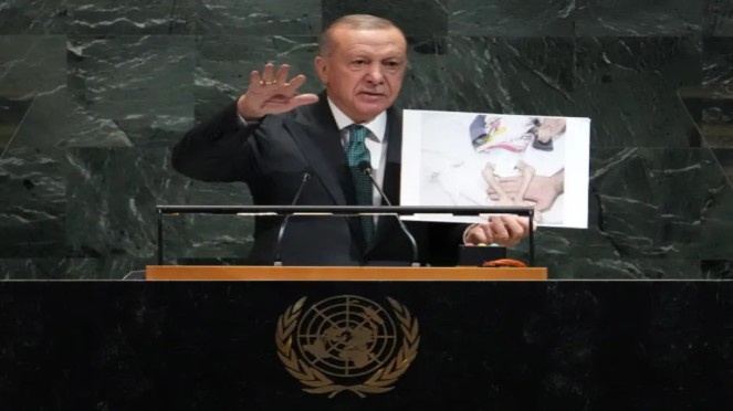 وبدأ الرئيس التركي كلمته بالتذكير بالكلمات الأولى من ميثاق الأمم المتحدة، التي تقول إن غايتها هو صون الأمن والسلم الدوليين، وقال "ونحن نحتفل بالذكرى الثمانين للأمم المتحدة في هذه القاعة يشهد العالم الأحداث الخطيرة والتي تلقي بظلال قاتمة على كلمات ميثاق الأمم المتحدة ومادته الاستهلالية، وخاصة ما يحدث في غزة بشكل خاص التي تشهد إبادة جماعية منذ أكثر من 700 يوم".