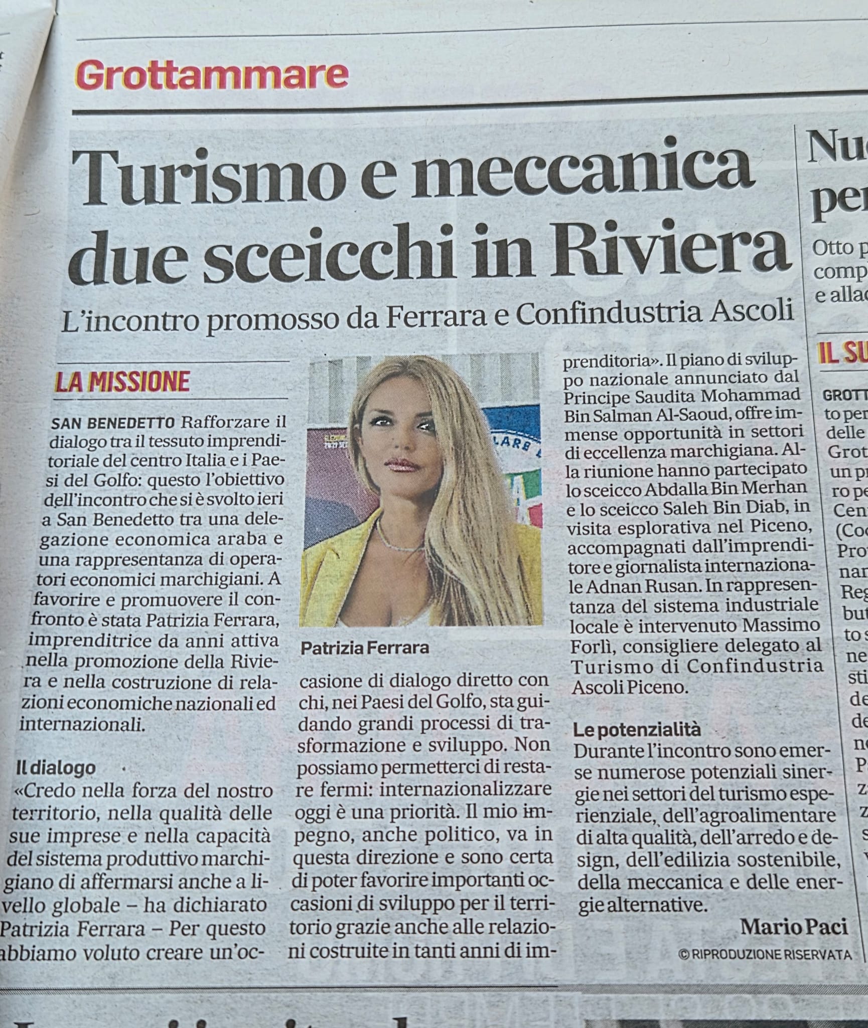 بهدف دعم وتعزيز استراتيجية التدويل الخاصة بها وبمبادرة من الاقتصادي والكاتب الاردني عدنان الروسان وترتيبات مع رجال اعمال سعوديين ، أعلنت السيدة باتريسيا فيرارا، المرشحة للانتخابات الإقليمية في مقاطعة أسكولي بيتشينو في منطقة ماركي، عن إطلاق بعثة تجارية متعددة القطاعات إلى الرياض، عاصمة المملكة العربية السعودية. تندرج هذه البعثة ضمن "مشروع المملكة العربية السعودية" الأوسع، وتهدف إلى ترسيخ الروابط الاقتصادية مع واحدة من أكثر الأسواق الناشئة حيوية على مستوى العالم.