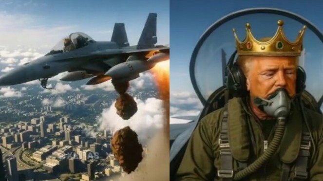 عمان1:نشر الرئيس الأميركي دونالد ترمب مقطع فيديو مُنفَّذاً بالذكاء الاصطناعي، عبر منصته «تروث سوشيال»، يظهر فيه مرتدياً تاجاً، ويقود طائرة حربية كٌتب عليها «الملك ترمب»، ويقصف حشداً من المتظاهرين المناهضين له بسائل بني.