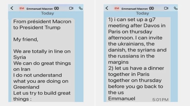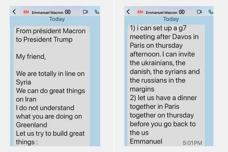 وأكد مصدر مقرب من الرئيس الفرنسي إيمانويل ماكرون لشبكة CNN أن رسالة نصية نشرها الرئيس الأمريكي دونالد ترامب من الرئيس الفرنسي إيمانويل ماكرون تشكك في موقفه من غرينلاند صحيحة.