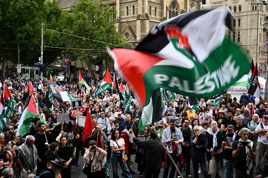 وتظاهر الآلاف في أنحاء أستراليا احتجاجاً على زيارة هرتسوغ. وفي سيدني، تجمع الآلاف في ساحة بحي الأعمال المركزي بالمدينة، واستمعوا إلى خطب ورددوا شعارات مؤيدة للفلسطينيين.