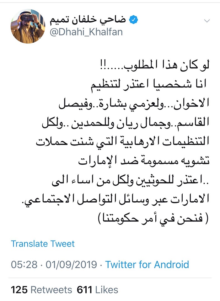 وقال خلفان في تغريدة حذفها عقب نشرها على حسابه الرسمي بتويتر: " أنا شخصيا أعتذر لتنظيم الإخوان، ولعزمي بشارة، وفيصل القاسم ، وجمال ريان، وللحمدين، ولكل التنظيمات الإرهابية التي شنت حملات مسمومة ضد الإمارات".