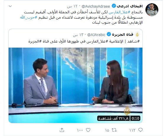 وأعرب أدرعي على "تويتر" عن أمنياته قائلا: "بالنجاح علا الفارس" لكن استوقفته كلمة واحدة جاءت على لسان الفارس، حيث قال :" لكن للأسف أخطأتِ في الجملة الأولى. أفيفيم ليست مستوطنة بل بلدة إسرائيلية مزدهرة تعرضت لاعتداء من قبل تنظيم حزب الله الإرهابي انطلاقًا من جنوب لبنان".