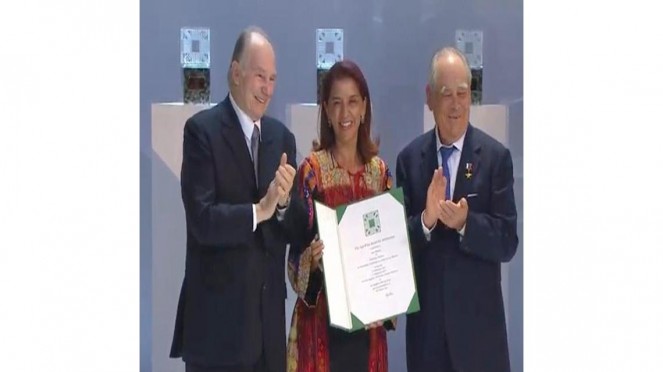 عمان 1 : تسلمت رئيسة مجلس إدارة المتحف الفلسطيني زينة جردانة، جائزة الآغا خان للعمارة 2019، في حفل بمدينة قازان في روسيا، من قبل صاحب السمو الآغا خان والمستشار الحكومي لجمهورية تتارستان، منتيمير شايمييف، وذلك بعد فوز المتحف بالجائزة التي تبلغ قيمتها مليون دولار.