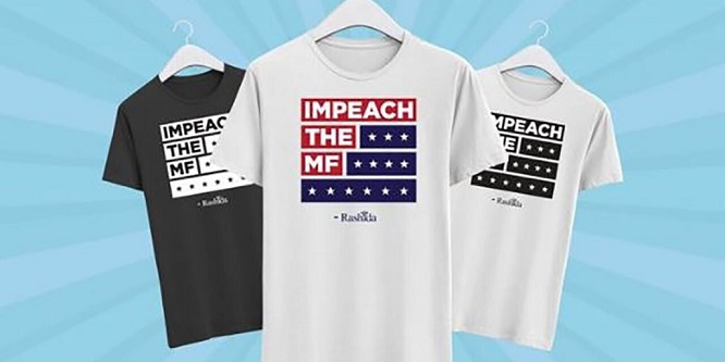 عمان1:قالت قناة Fox News الأمريكية إن حملة إعادة انتخاب النائبة رشيدة طليب بدأت ببيع قمصان بقيمة 29 دولاراً تحت شعار «Impeach the MF» أو «اعزلوا اللعين»، وذلك بعد يومين من إعلان رئيسة مجلس النواب نانسي بيلوسي أن الكونغرس سيبدأ تحقيقاً لعزل الرئيس دونالد ترامب.