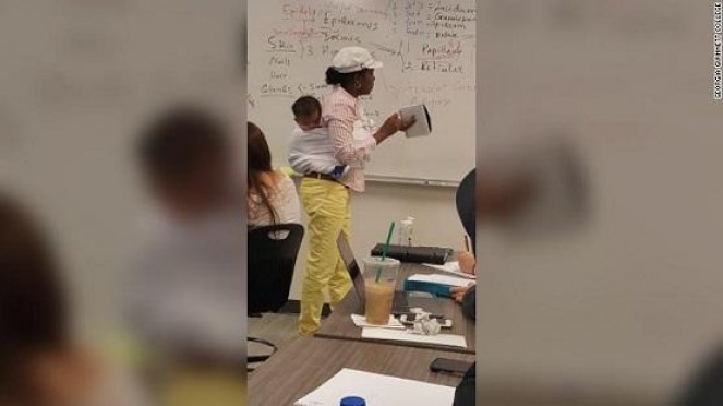قامت أستاذة في علم الاحياء بمدينة لورينسفيل بولاية جورجيا الأمريكية، بحمل طفل إحدى طالباتها أثناء الحصة التدريسية لتتمكن الأم من كتابة الملاحظات.