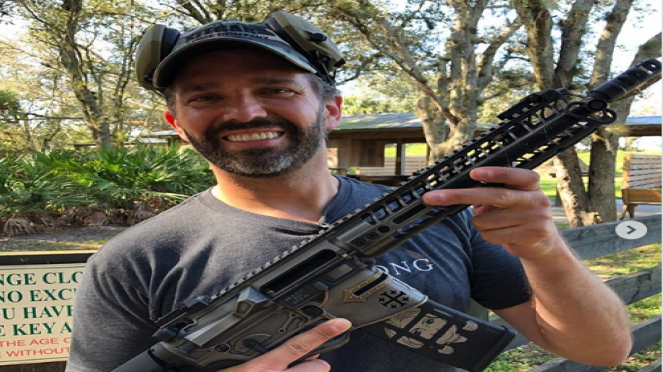 ويقف دونالد ترامب الابن ممسكا بيده بندقية AR-15 الأمريكية شبه الآلية، طُبع على متجر الذخيرة الخاص بها صورة وزيرة الخارجية الأمريكية السابقة هيلاري كلينتون وعي تقف خلف القضبان.