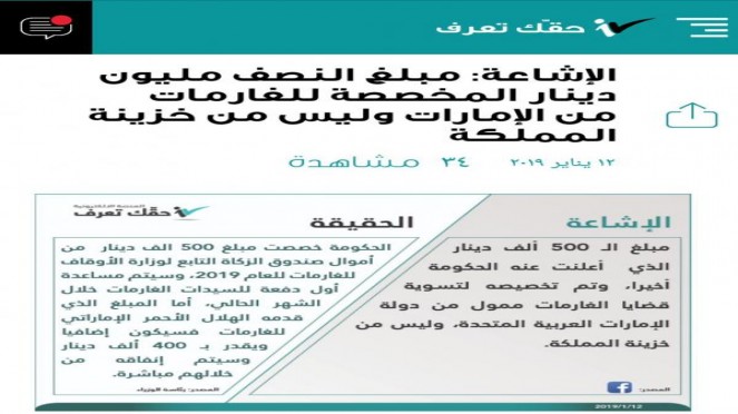 عمان 1- نفت الحكومة اليوم السبت عبر منصة حقك تعرف ما يشاع حول الـ 500 الف دينار المخصصة للغارمات انها من دولة الامارات، مؤكدة انها من خزينة الدولة. |