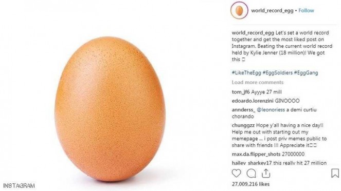 عمان 1 : تمكنت صورة بيضة من إزاحة عارضة الأزياء كايلي جينر من عرش "إنستغرام"، لتصبح صاحبة الرقم الأكبر بعدد حالات الإعجاب على موقع التواصل الاجتماعي.