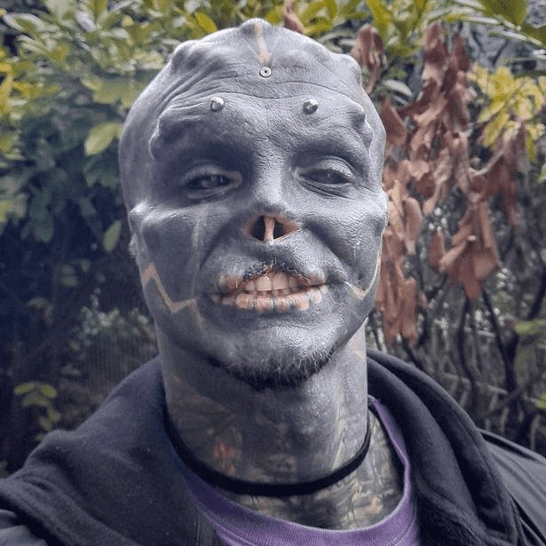 وبحسب صحيفة "ميرور"، يكافح الشاب لجعل نفسه أشبه بكائن فضائي، حيث قام بتعديلات كبيرة على شكل وجهه، بما في ذلك مقلتا عينيه، وغطى نفسه بالوشم ليبدو كأنه كائن أسود من خارج كوكب الأرض.