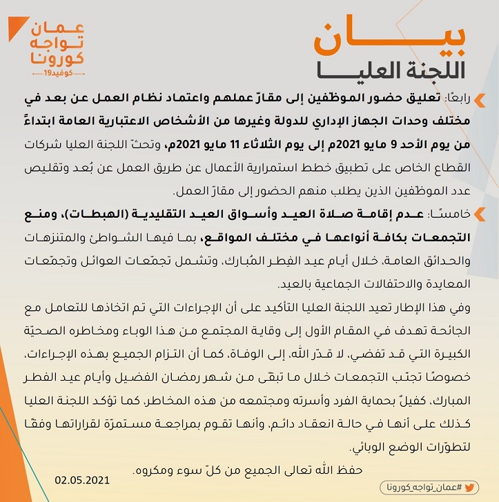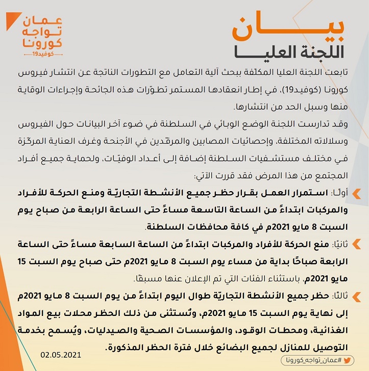 عمان1:أعلنت سلطنة عمان حظر حركة الأفراد والمركبات من الساعة الـ7 وحتى الـ4 فجرا، اعتبارا من يوم السبت القادم وحتى 15 مايو ضمن إجراءات كورونا.