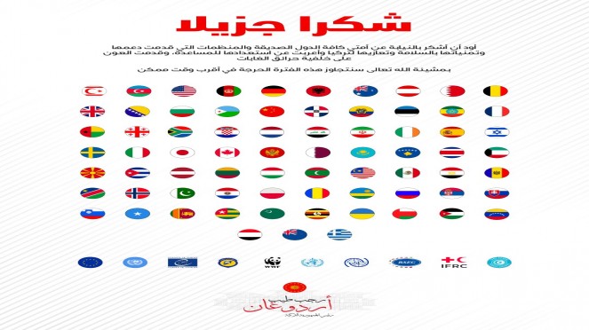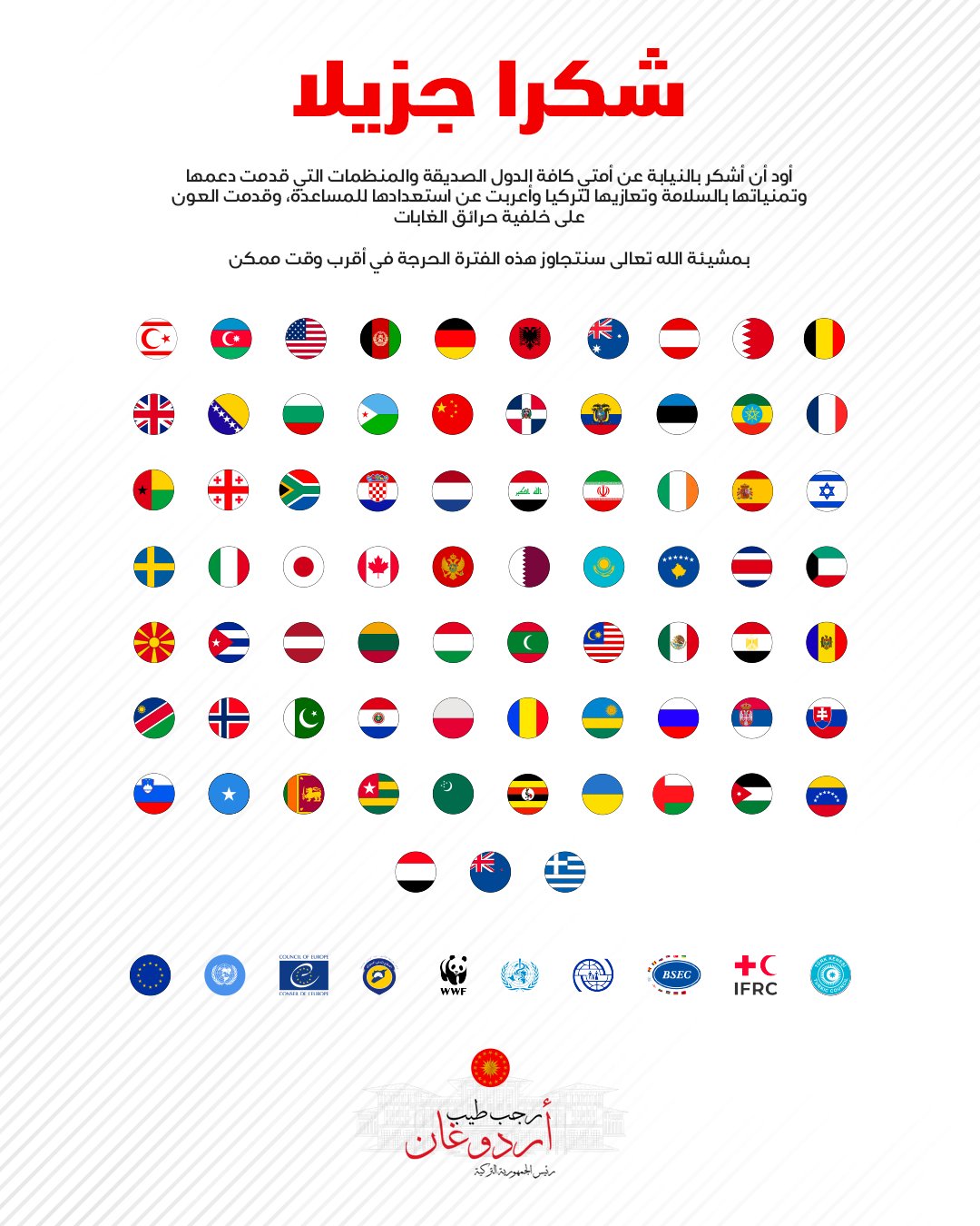 وكتب أردوغان في تغريدة عبر صفحته الرسمية على تويتر "أود أن أشكر بالنيابة عن أمتي كافة الدول الصديقة والمنظمات التي قدمت دعمها وتمنياتها بالسلامة وتعازيها لتركيا وأعربت عن استعدادها للمساعدة، وقدمت العون على خلفية حرائق الغابات.. بمشيئة الله تعالى سنتجاوز هذه الفترة الحرجة في أقرب وقت ممكن".