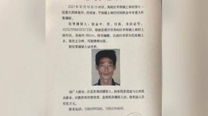 وتقول الشرطة الصينية إنها تطارد “أو جيزونغ” البالغ من العمر (55 عاما)، بعدما فر من قريته في مقاطعة فوجيان، جنوب شرقي الصين.