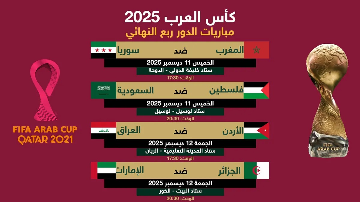 الإنفوغرافيك المرافق يوضح جدول مواجهات الدور ربع النهائي لبطولة كأس العرب 2025، حيث ستكون المواجهة الأولى بين المغرب وسوريا، فيما يتواجه منتخب فلسطين مع السعودية في المباراة الثانية التي ستجري يوم الخميس 11 ديسمبر.