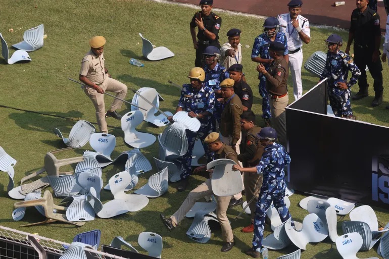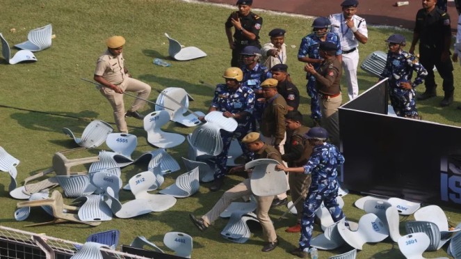 وأظهر مقطع فيديو نشرته وكالة "آني" الهندية مشجعين وهم يرمون مقاعد مكسورة من المدرجات وأشياء أخرى إلى أرض الملعب وإلى مضمار ألعاب القوى، كما قفز عدد من الأشخاص فوق السياج المحيط بساحة اللعب.