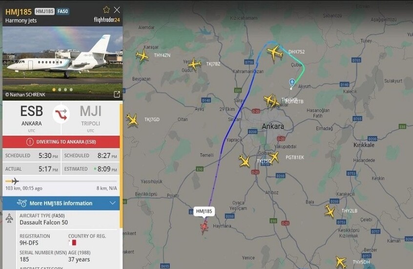 وقال دوران "أقلعت طائرة خاصة تقل رئيس الأركان العامة الليبي محمد علي أحمد الحداد، و4 أشخاص مرافقين له، و3 من أفراد الطاقم من مطار أسن بوغا، ثم أبلغت مركز مراقبة الحركة الجوية عن حالة طوارئ بسبب عطل كهربائي، وطلبت هبوطا اضطراريا".