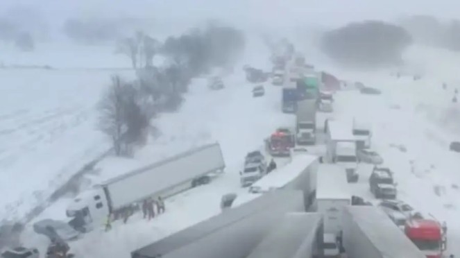 وأفاد مسؤولون في الولاية بأن السلطات تعمل على فتح طريق شهد حادث اصطدام بين أكثر من مئة سيارة وشاحنة في ظل عاصفة ثلجية قوية.