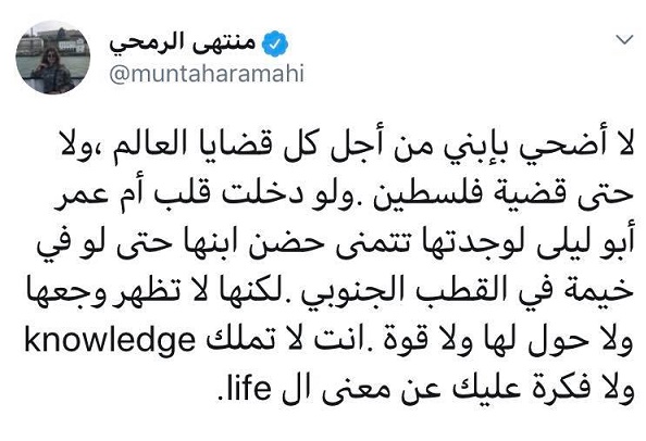 وقالت “الرمحي” في تغريدة لها على صفحتها بتويتر بعد سجال مع متابعيها مع نصه:”لا أضحي بإبني من أجل كل قضايا العالم، ولا حتى قضية فلسطين ولو دخلت قلب أم عمر أبو ليلى لوجدتها تتمنى حضن ابنها حتى لو في خيمة في القطب الجنوبي، لكنها لا تظهر وجعها ولا حول لها ولا قوة.”