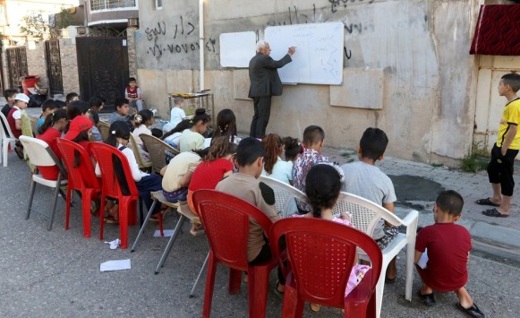 وينظم المعلم خميس علي (70 عاما) دروسا التحق بها عشرات التلاميذ، على نفقته الخاصة، في الشارع المقابل لمنزله، في الكركوك المدينة الغنية بالنفط.