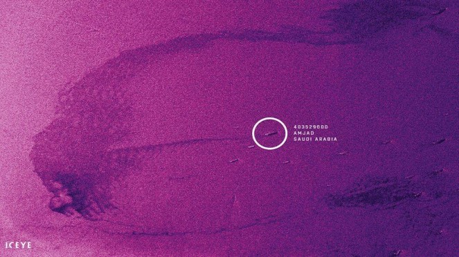 وأكدت شركة Iceye الفنلندية للرادارات الفضائية أن صورا التقطها أحد راداراتها بعد يومين من الحادثة وثّقت هذا التسرب الذي وُصف بأنه "كبير" في مياه خليج عمان حيث تعرضت ناقلة النفط "أمجاد" السعودية وثلاث سفن أخرى للتخريب من قبل طرف مجهول خارج ميناء الفجيرة الإماراتي.